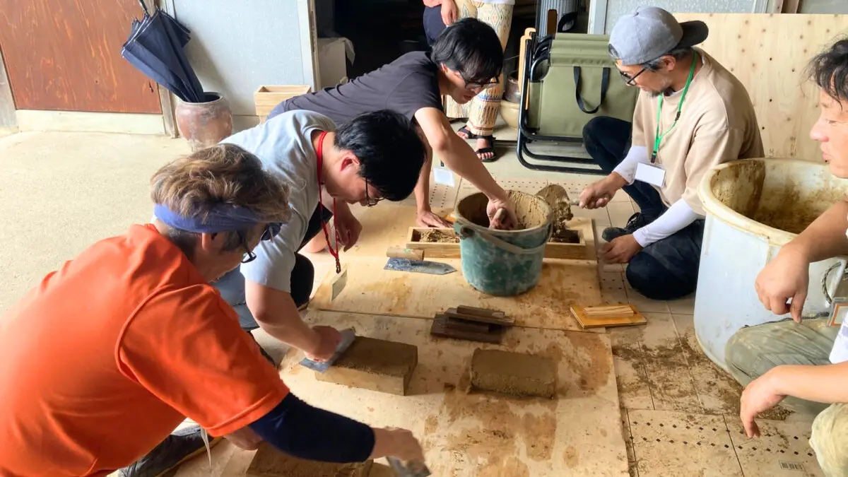 選べるコース1つ目の「DIYおかわりワークショップコース」では、古民家の土壁を再利用してレンガをつくる体験を行いました。