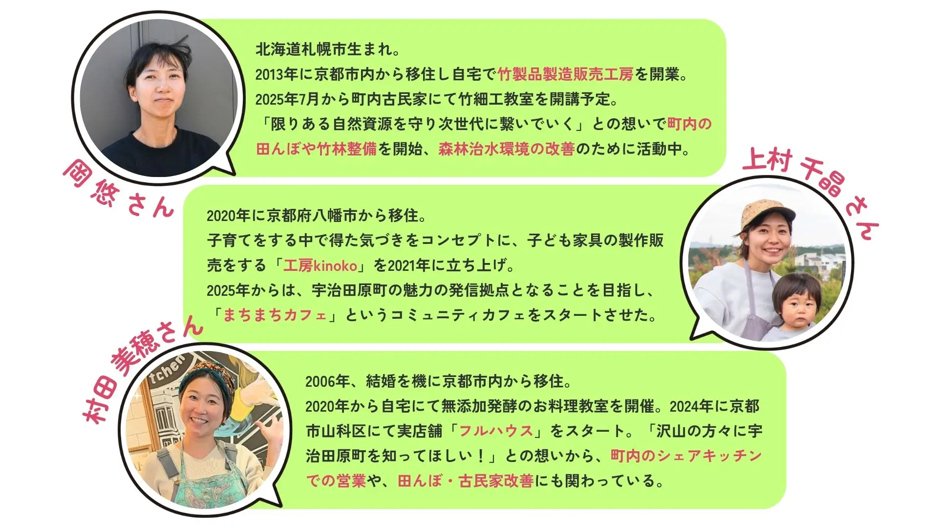 メインゲストとして、先輩移住者の岡 悠さん・上村 千晶さん・村田 美穂さんをお迎えした他、地域住民として田中さん親子(田中 大典さん&澄子さん)が、またDIYワークショップでは、工房kinokoの上村 正義さん・左官職人の三枝 良さんにお世話になりました。
