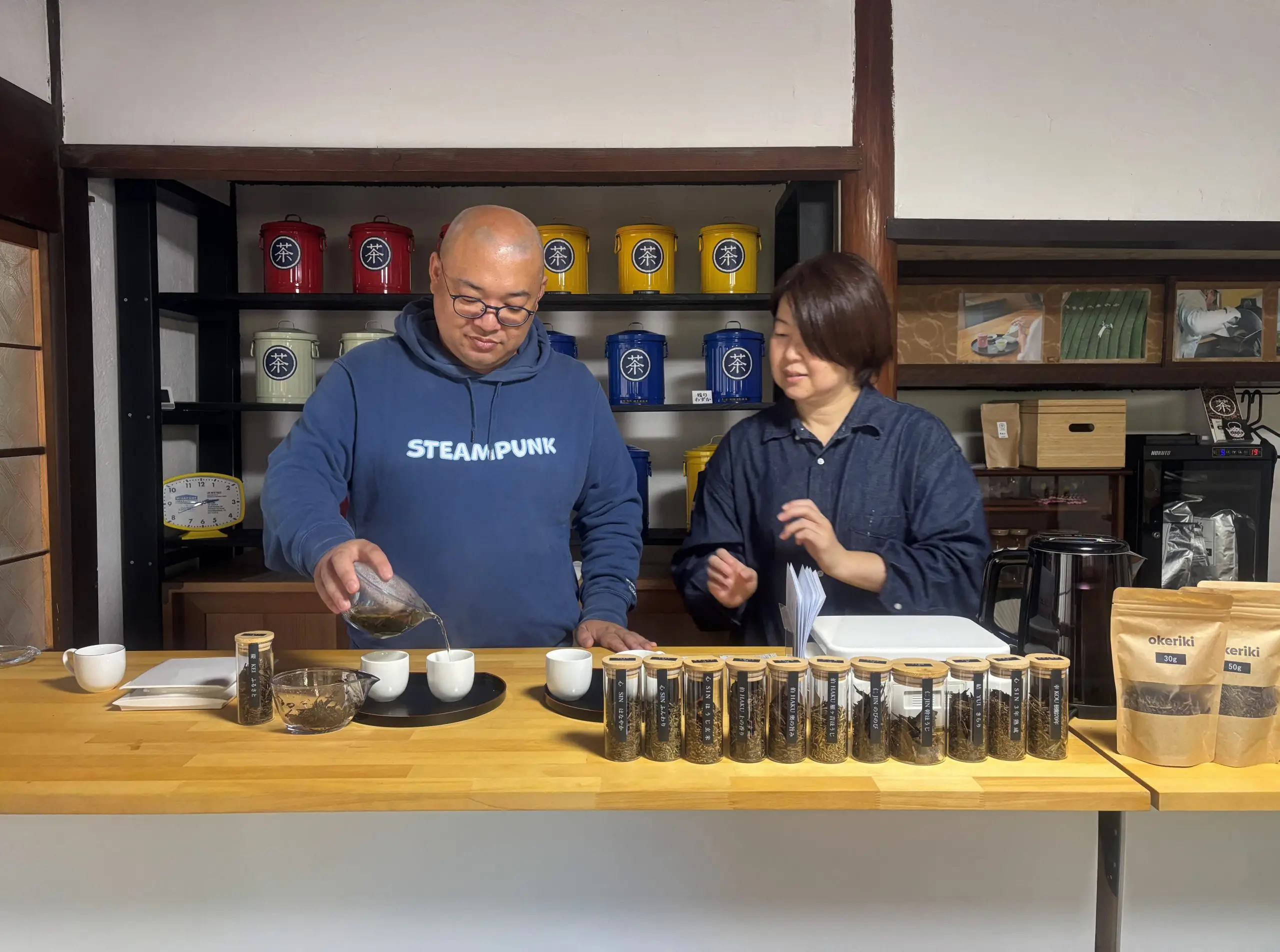 昨年には、和束の茶農家さんを集めて自分たちのお茶を振る舞いあう、お茶のテイスティングイベント「茶源郷和束ティーパーティー」なんかも企画しました。実はほうじ茶って茶農家さんにとっては、家庭で日常的に飲むものというイメージであまり注目されていなかったんですが、家庭ごとに焙煎方法にこだわりがあるんです。なのでイベントでは、農家さん達が初めてお互いのお茶をしっかり飲んで、「ほうじ茶ってひとつひとつこんなに違うんや」って驚いていただけました。その印象が自分の中に強く残っていて、桶力茶店を始めるヒントになりました。お店のサブタイトル「Roasted Tea Party」の由来でもあります。