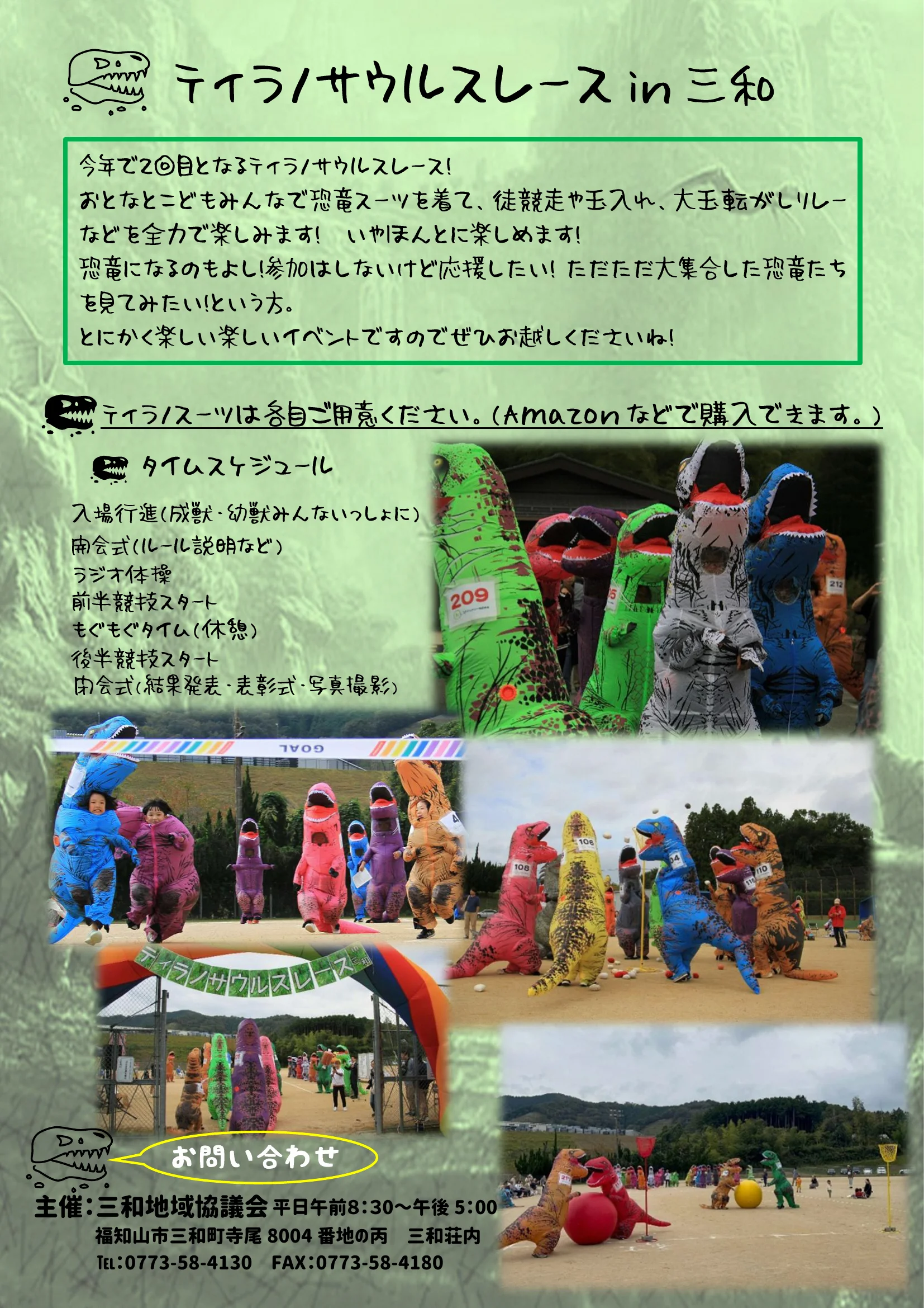 恐竜の着ぐるみを着て走る動きはとてもコミカルで、参加する人も見ている人も楽しめます。