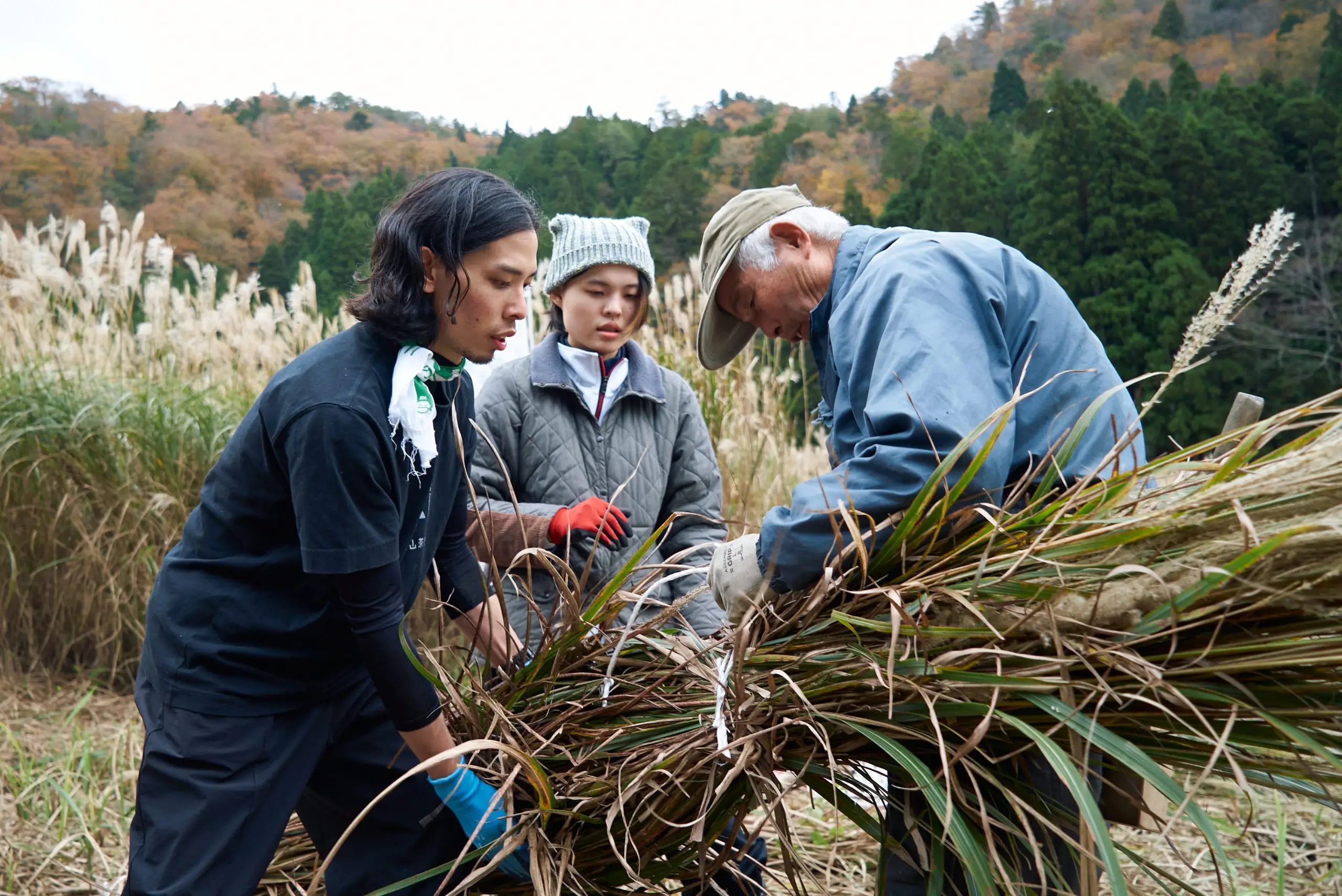 茅葺き(かやぶき)屋根の原料となる「茅(かや)」を自ら刈り取り、集落の方々と肩を並べて手仕事に没入する一日。