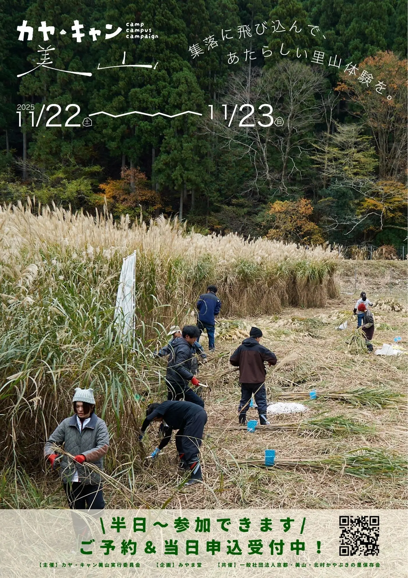 京都府南丹市・美山かやぶきの里の茅場を舞台に、地域の暮らしと景観を支えてきた伝統行事「茅刈り(かやかり)」を体験できるチャリティイベント『カヤ・キャン美山2025』を、2025年11月22日(土)・23日(日)に開催します!