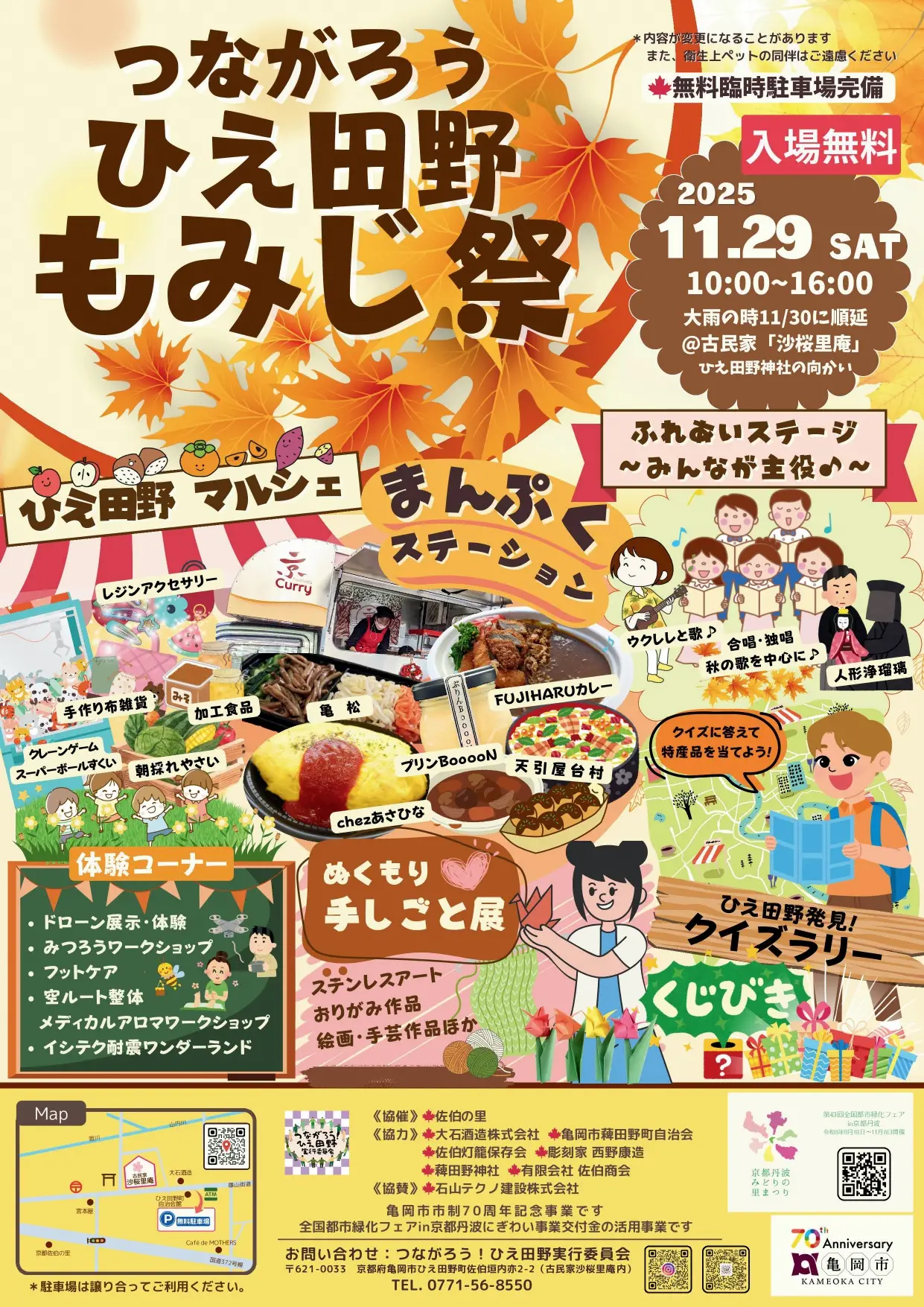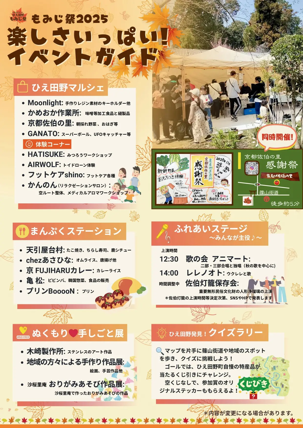 「もみじ祭」は、ひえ田野町の皆さんの手づくりの温もりあふれるマルシェ、出来たてがおいしい屋台村、人気のキッチンカーやハンドメイド作品が並ぶこのお祭りは、地域の元気や笑顔が集まる特別な一日です。