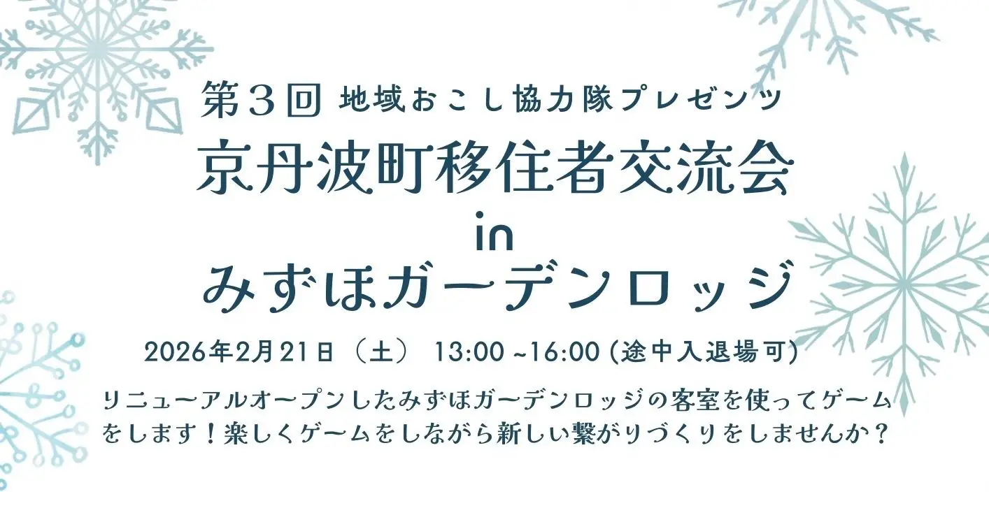 リニューアルオープンに併せてリフォームされたみずほガーデンロッジを会場に、客室も利用しながらゲームをしたり、移住者、移住検討中の方、地元の皆様で楽しく交流していただく時間となればと思います。