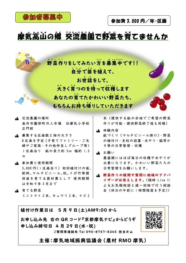 旧摩気小学校の近くの「高山の郷交流農園」で、自分で苗を植えて、お世話をして、大きく育つのを待って、収穫することができます!