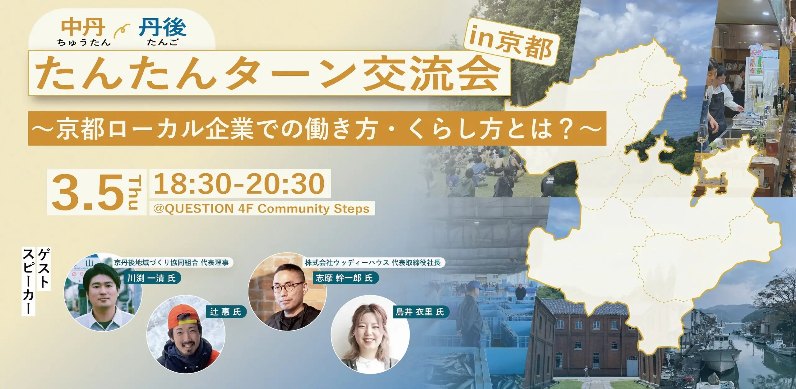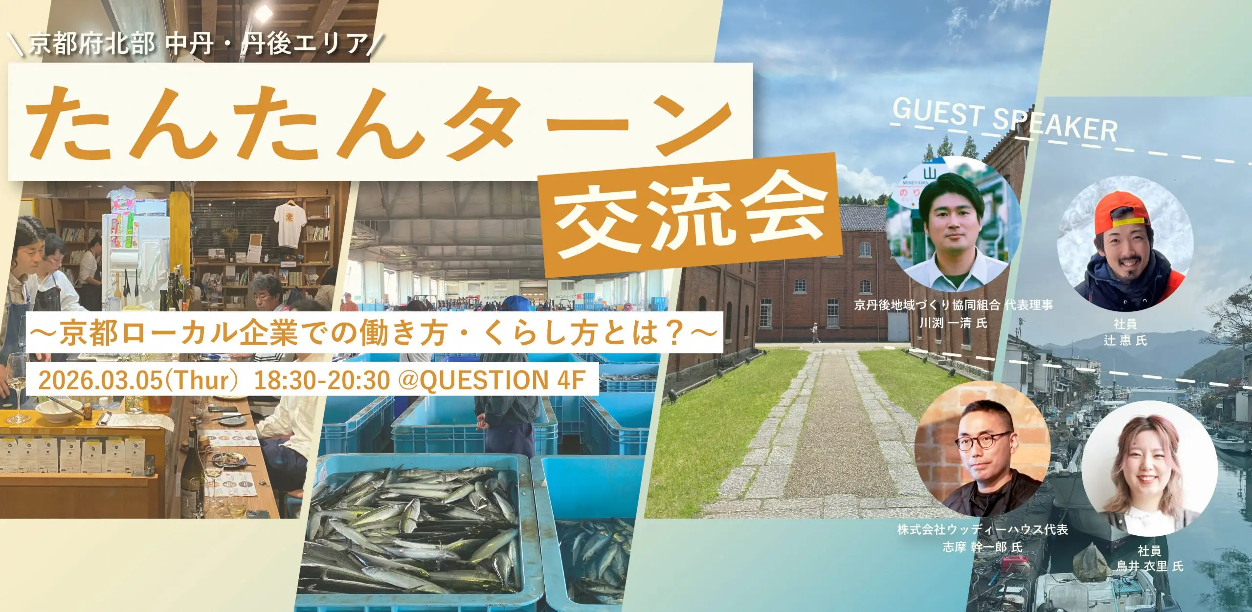 「たんたんターン交流会」では、京都府北部でユニークな活動や事業を行う企業の経営者と若手社員をゲストに迎え、それぞれの視点から京都北部のリアルと面白さを紐解きます。