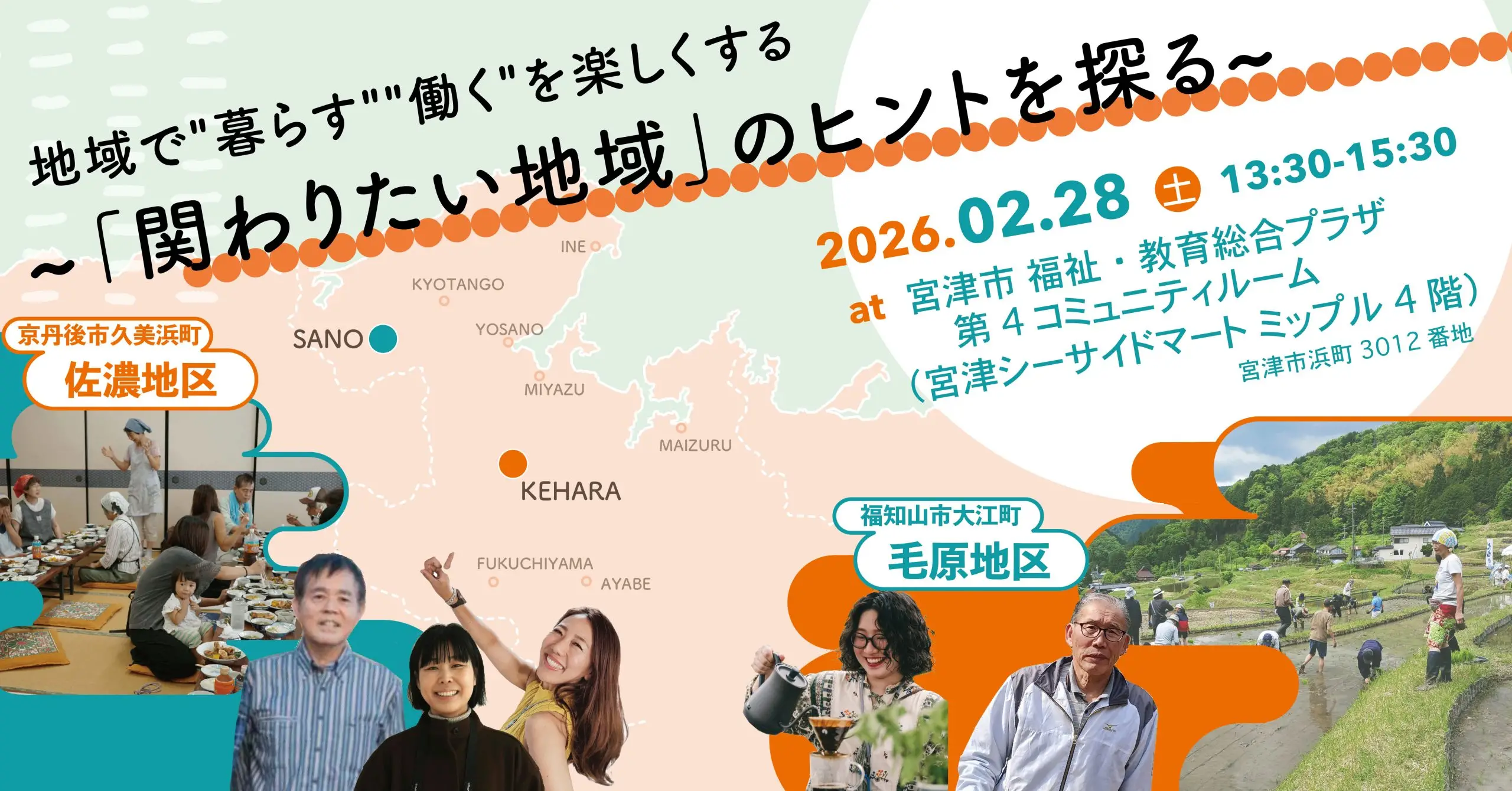 にとって、どうしてその地域に”関わりたい”と思ったの? どうだったから”関わりやすかった”の? を地元×移住者で取り組んでいる2地域《京丹後市久美浜町佐濃地区》、《福知山市大江町毛原地区》をお呼びし掘り下げます!