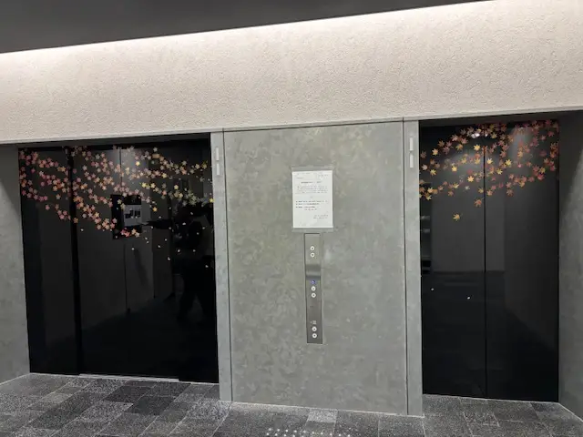 1階エレベータの扉には、漆黒に輝く屋外用漆に桜と紅葉の蒔絵が施されております。