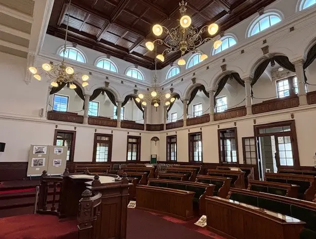 その京都府庁旧本館には、明治期の姿を忠実に復元した、日本最古の現存議場で知られる旧議場があります。曜日によっては一般見学をすることができます。「京都らしい重厚さとモダンさを同時に感じられる空間」だと思いますので皆様もぜひ・・・。